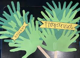 Instructions: Have the children trace their hands on the construction paper (about 8-10 times). Cut out the hand prints. Have the children tape/glue their hand prints onto a popsicle stick to create a palm branch Add a small banner with yellow construction paper that says "Hosanna" (see image below).